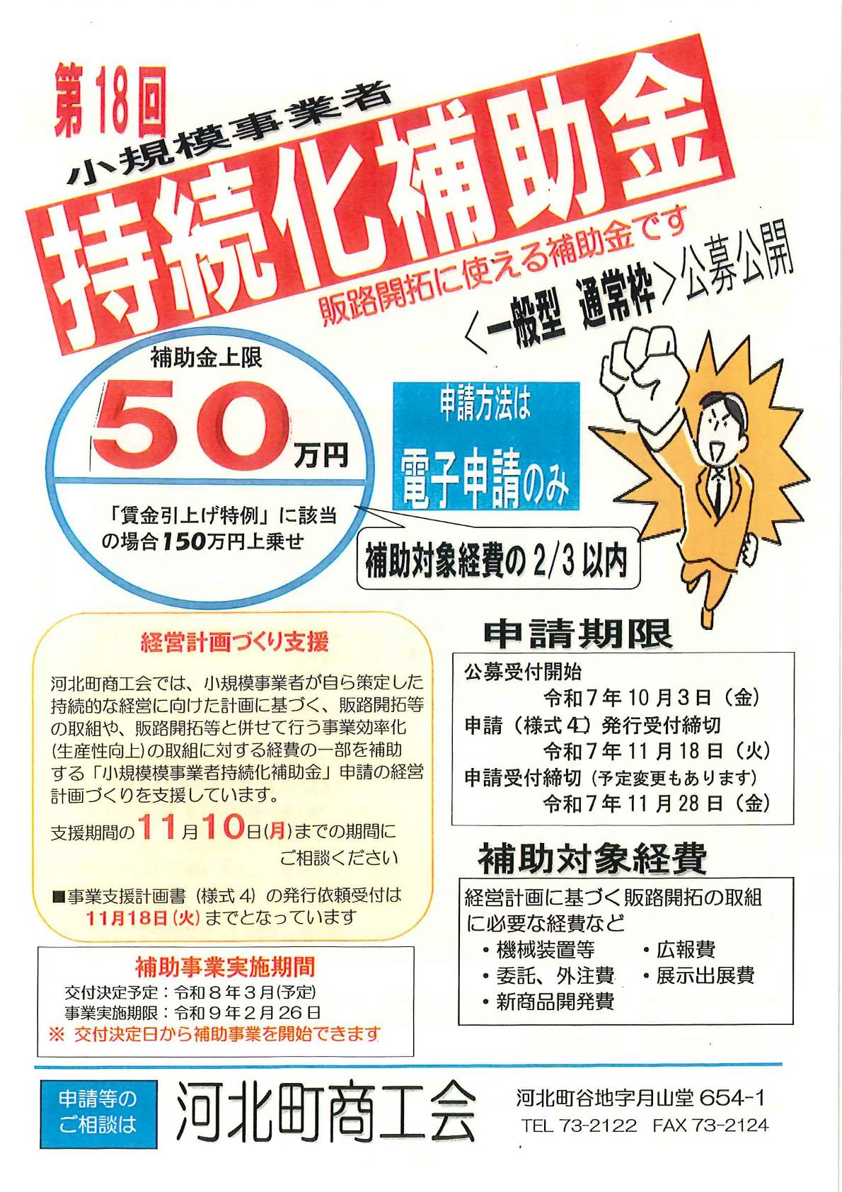 河北町商工会では、第18回小規模事業者持続化補助金(一般型)の公募が開始されました。この補助金は、小規模事業者の販路開拓や業務効率化に向けた取り組みを支援するものです。補助対象経費の2/3以内、最大50万円(賃金引上げ特例に該当する場合は150万円)が補助されます。事業の成長や新しい挑戦を考えている方にとって、大きな支援となる制度ですので、この機会にぜひご活用ください。