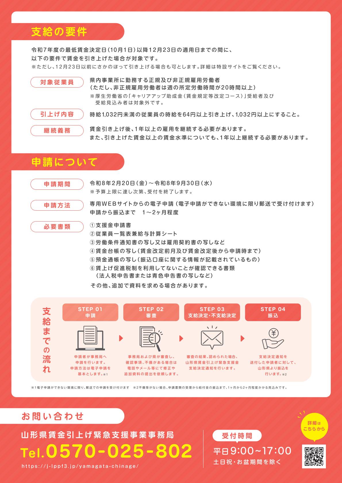 山形県「賃金引上げ緊急支援」のご案内 お知らせ Release : 2026.02.18 18:39:37 Updated : 2026.02.18 18:39:37 山形県「賃金引上げ緊急支援」のご案内 最低賃金引上げに対応した事業者を支援する県の制度がスタートします。山形県では、最低賃金の大幅な引上げに伴い、賃金を引き上げた事業者の皆様の負担を軽減し、賃金アップを後押しするための支援金制度を実施しています。 申請期間:令和8年2月20日(金)〜9月30日(水) 地域別最低賃金の引上げへの対応として、急激な賃上げに苦慮する事業者の皆様の負担を軽減し、賃金アップを後押しするための支援金です。 資料ダウンロード 山形県「賃金引上げ緊急支援」のご案内 この記事を共有SHARE Twitter facebook Google+ RSS 前の記事 最新の記事